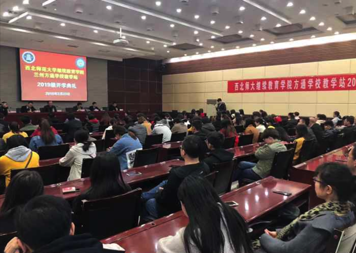 3月23日上午,西北师范大学继续教育学院兰州方通学校教学站2019级新生开学典礼在西北师大专家楼会议厅举行。西北师范大学继续教育学院李宝麟院长、学院相关部门负责人、兰州方通学校教学站全体教职工及2019级新生共一百多人参加了典礼。