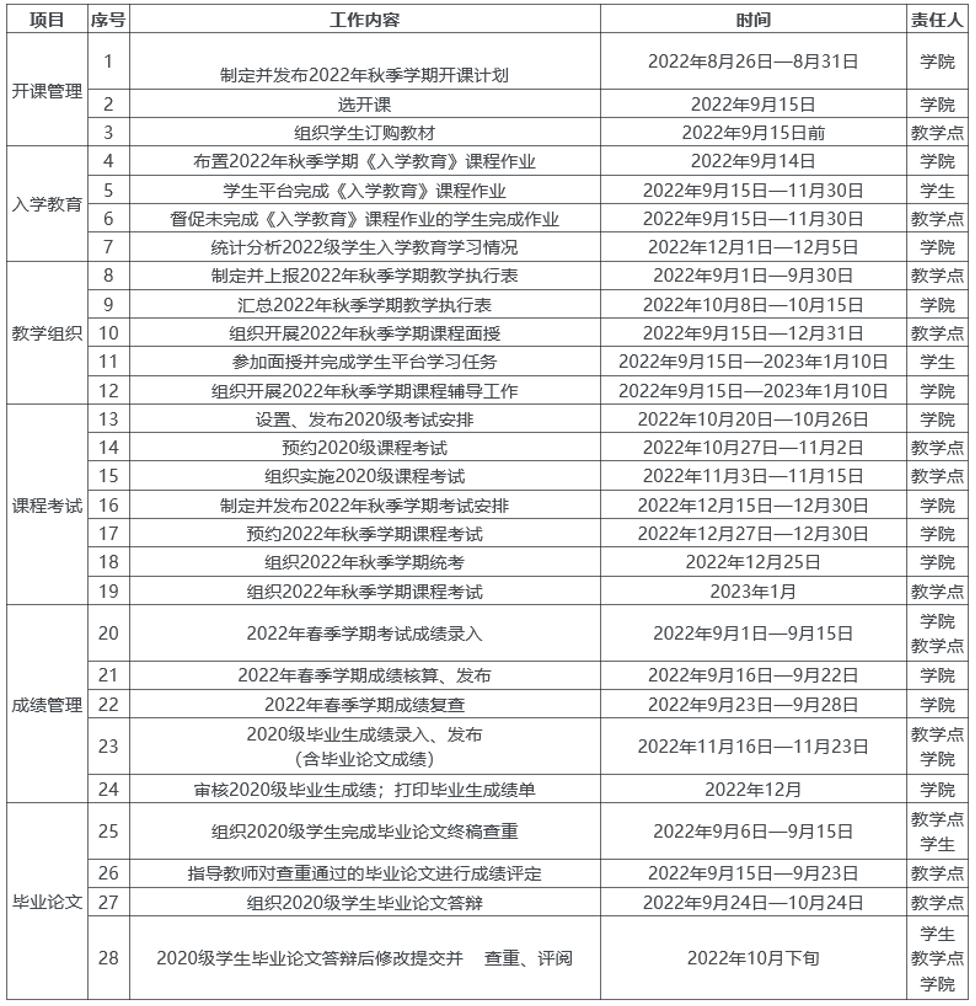 各校外教学点: 根据教学计划进度安排,现将成人教育2022年秋季学期教学教务工作安排公布如下,请各教学点遵照执行。
