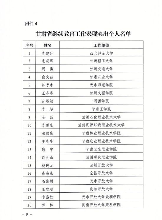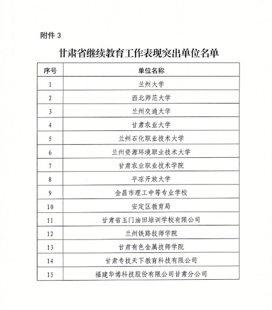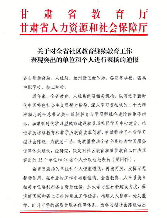 近日,甘肃省教育厅、甘肃省人力资源和社会保障厅联合印发《关于对全省社区教育继续教育工作表现突出的单位和个人进行表扬的通报》,对全省社区教育和继续教育工作表现突出的35个单位和94名个人予以通报表扬。其中,西北师范大学作为甘肃省继续教育工作表现突出单位获通报表扬;李建升教授作为甘肃省继续教育工作表现突出个人获通报表扬。