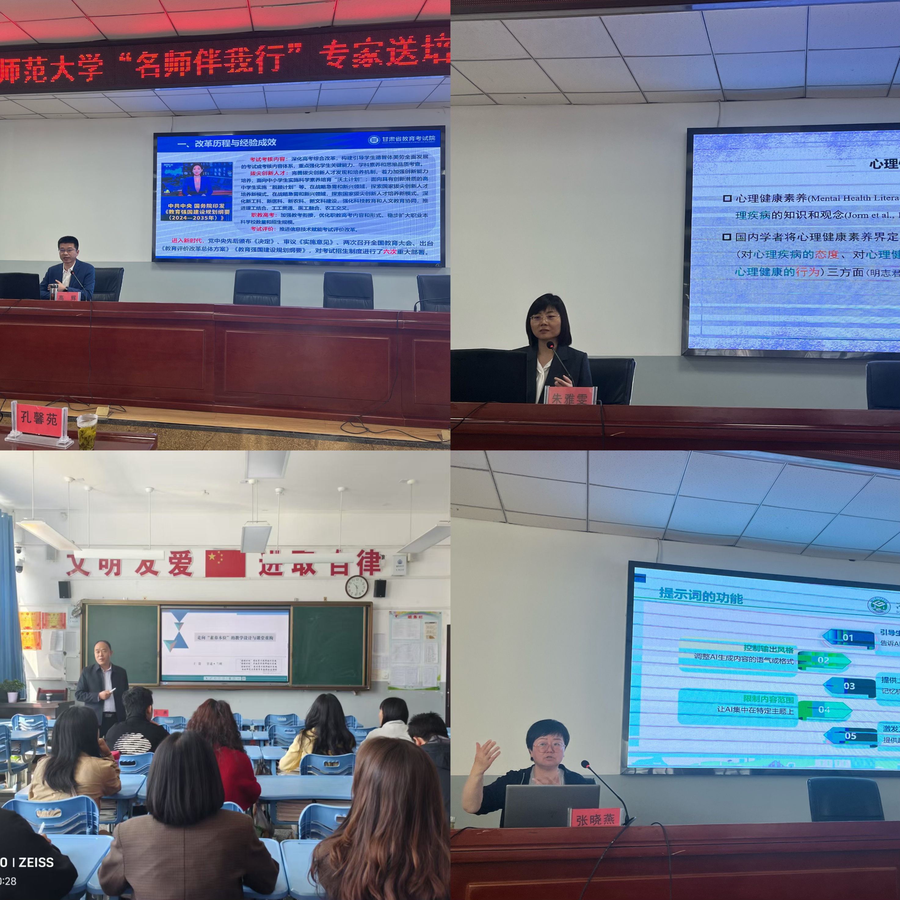 活动聚焦教师发展核心需求,设置多领域专题培训。张晓燕结合DeepSeek教学工具,解析人工智能与课堂融合的创新路径;王贵以新课标为导向,探讨课程思政改革与课堂情境重构策略;朱雅雯围绕情绪管理与师生沟通技巧,为教师提供心理调适方案。此外,甘肃省教育考试院专家还针对高考志愿填报政策进行深度解读。参训教师通过案例研讨、实操演练与专家互动,表示“内容针对性强,对教学实践启发显著”。