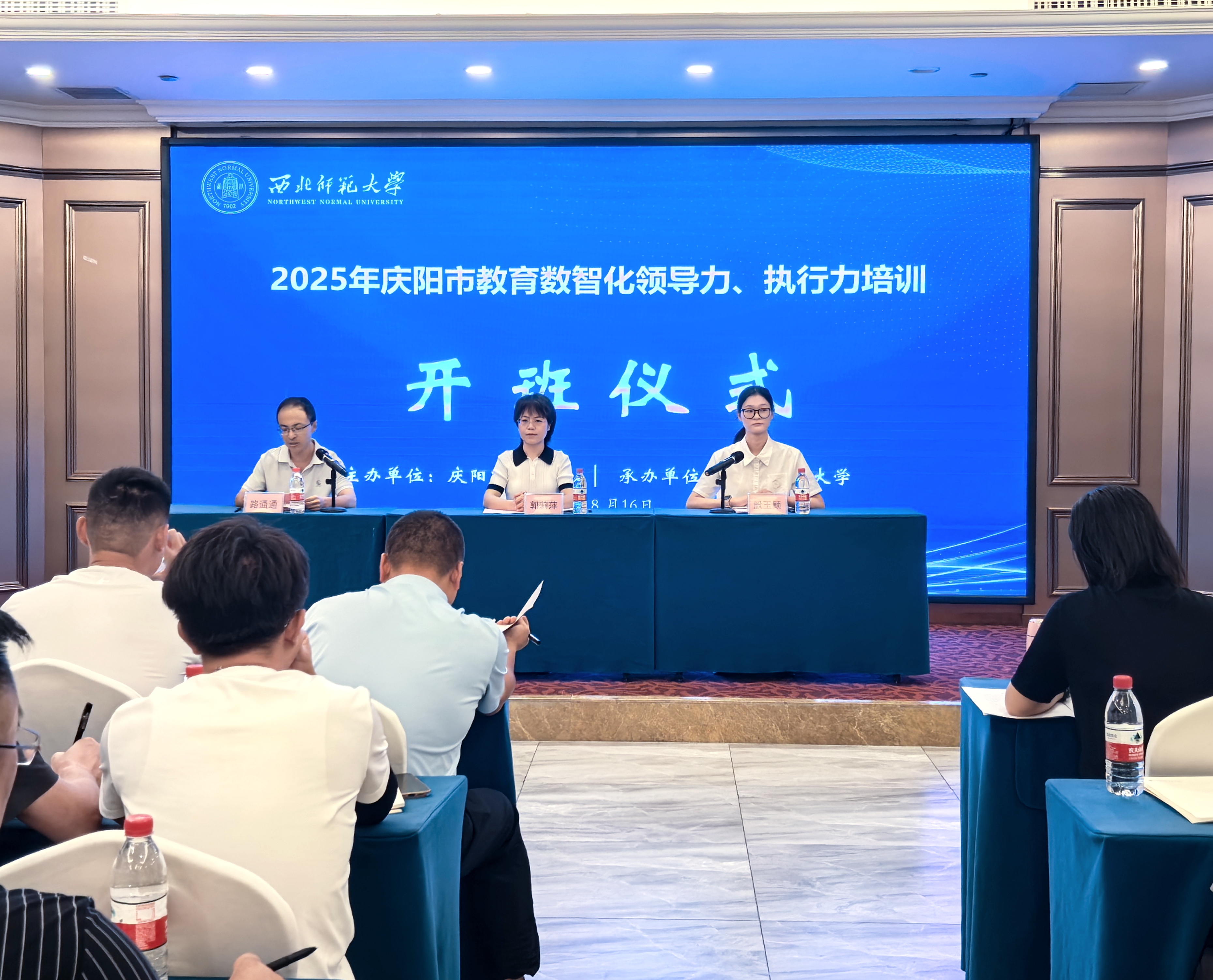 2025年8月16日,庆阳市教育数智化领导力、执行力研修项目在成都开班。庆阳市教育局项目主任路通通、西北师范大学继续教育学院副院长郭莉萍出席开班仪式。来自庆阳市市县(区)教育局管理人员、中小学校长100人;中小学副校长、中层管理人员60人,以及西北师范大学继续教育学院相关工作人员参加开班仪式。
