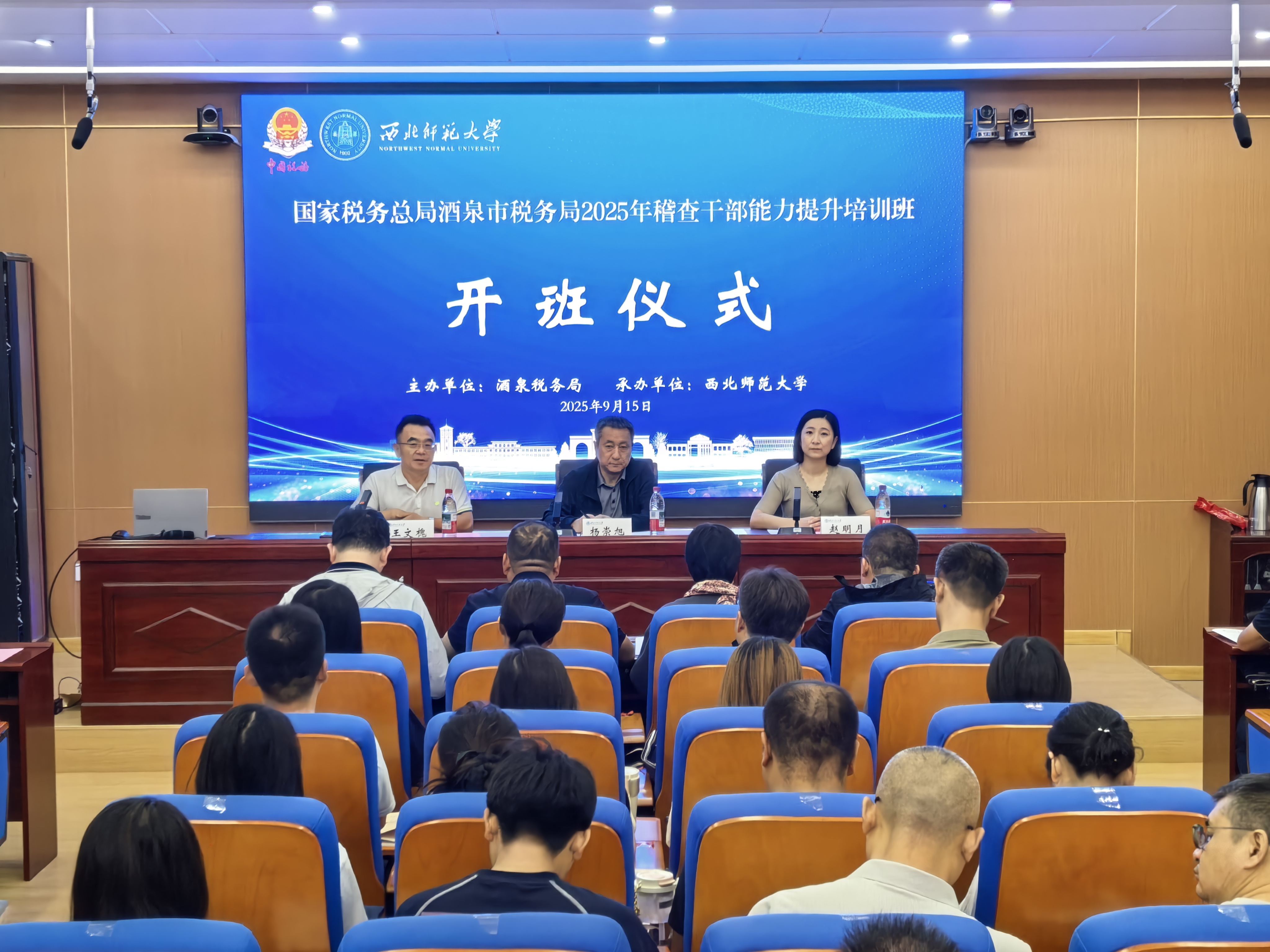 2025年9月15日上午,国家税务总局酒泉市税务局2025年稽查干部能力提升培训班开班仪式在西北师范大学举行。酒泉市税务局党委委员、总会计师杨崇旭,甘肃省教师发展中心(甘肃教师教育学院)常务副主任王文槐出席仪式并讲话,来自酒泉市税务稽查战线的53名学员及继续教育学院相关工作人员参加仪式,仪式由西北师范大学继续教育学院培训中心老师主持。