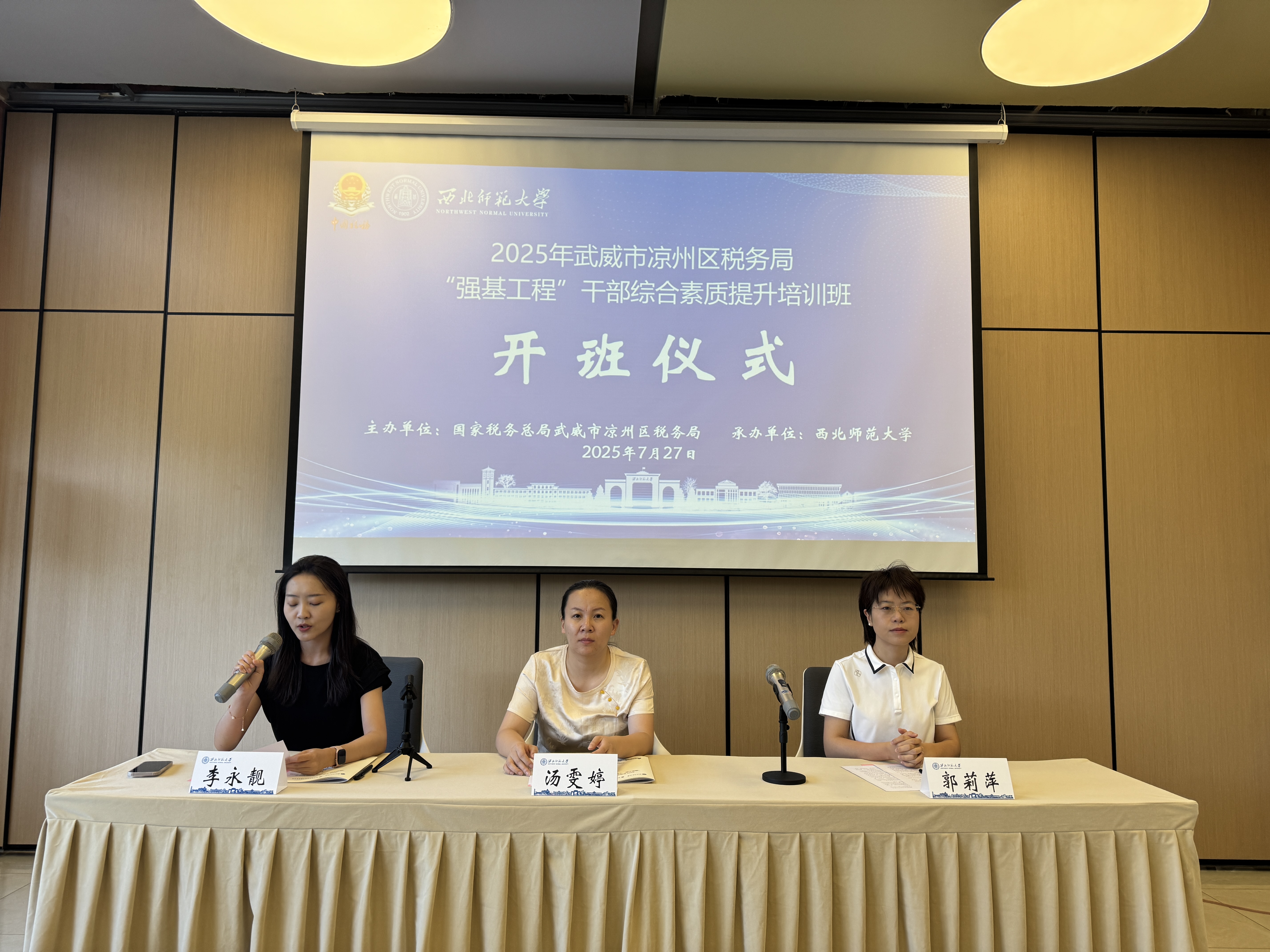 2025年7月27日上午,2025年武威市凉州区税务局“强基工程”干部综合素质提升培训在西北师范大学顺利开班。国家税务总局武威市凉州区税务局副局长汤雯婷、西北师范大学继续教育学院副院长郭莉萍出席开班仪式并讲话。来自武威市凉州区税务局的50名干部齐聚兰州,开启素质提升的学习之旅。继续教育学院师资培训中心教师主持开班仪式。