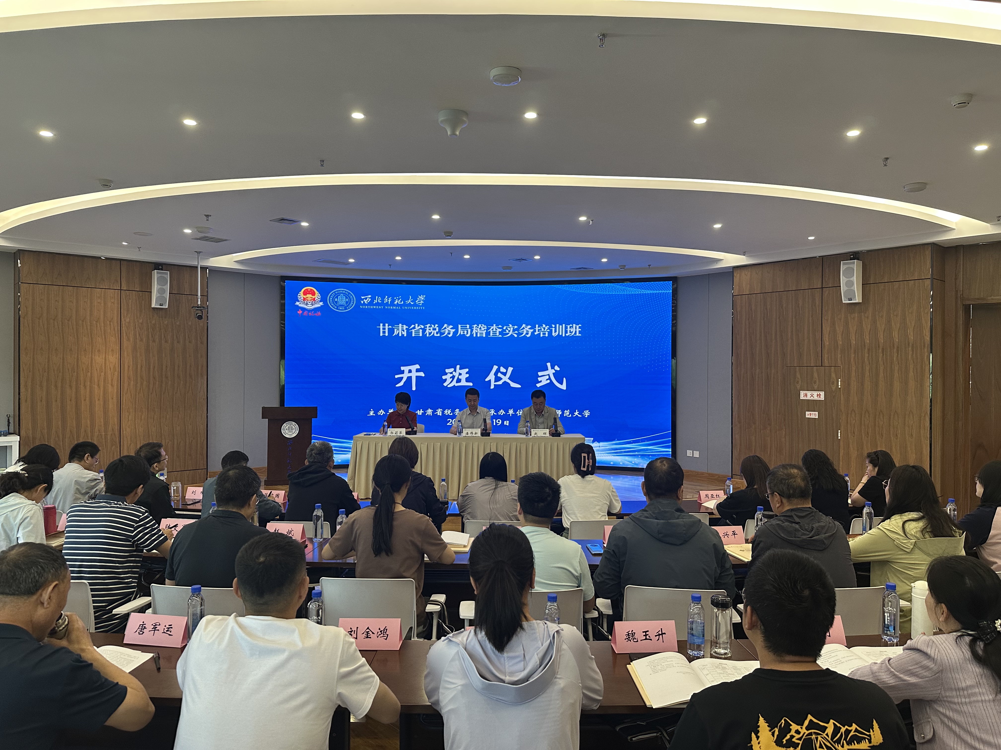 2025年5月19日上午,甘肃省税务局稽查实务培训班在西北师范大学正式开班。继续教育学院院长赵辉,甘肃省税务局稽查局副局长潘伟新出席开班仪式并讲话。开班仪式由继续教育学院副院长郭莉萍主持,来自全省税务稽查条线从事选案、检查、审理、执行工作的干部和社保非税业务骨干101名学员及继续教育学院相关工作人员参加开班仪式。