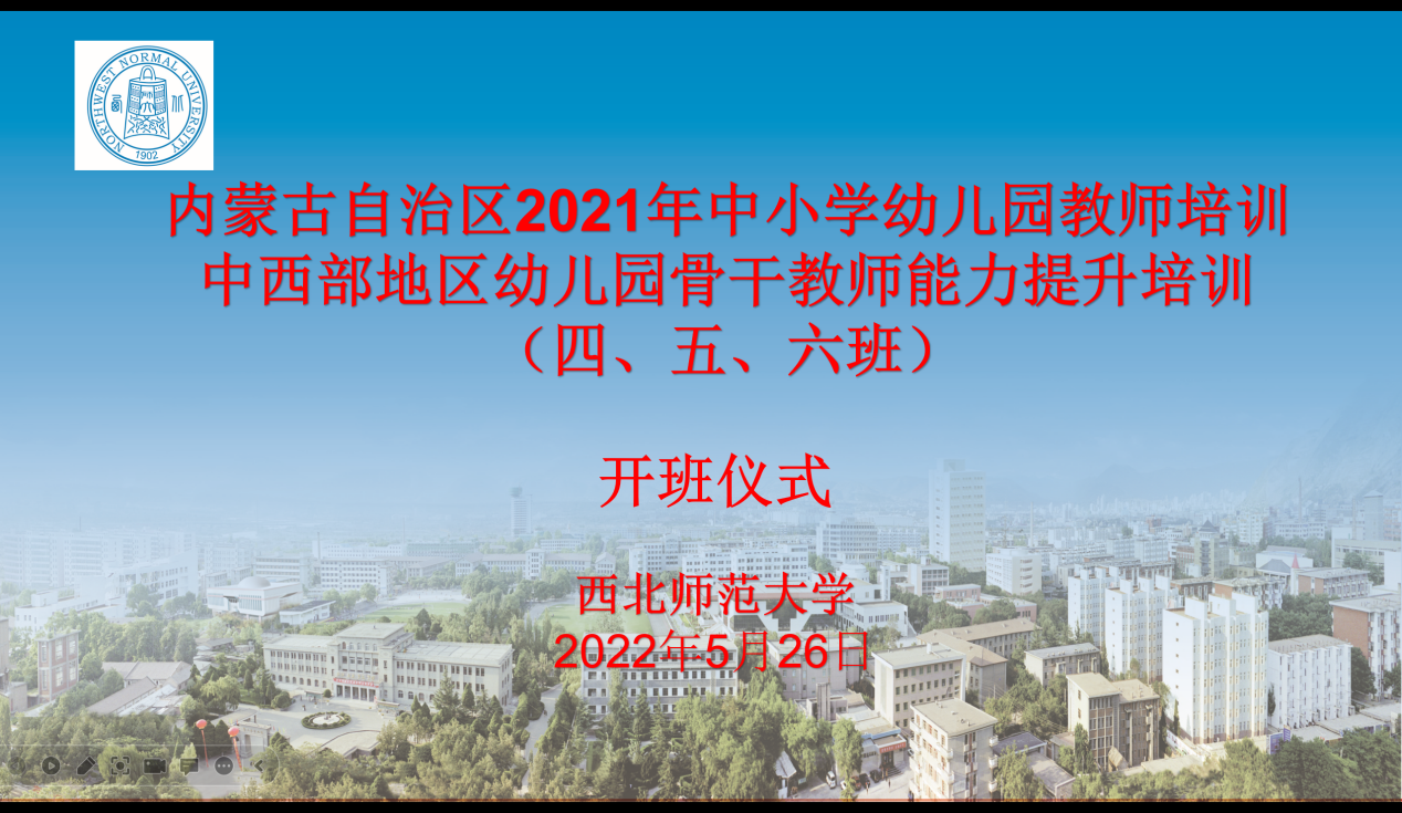 5月26日早上,由西北师范大学继续教育学院承办的内蒙古自治区2021年中小学幼儿园教师培训—中西部地区幼儿园骨干教师能力提升培训四、五、六班以线上形式举行开班典礼。西北师范大学继续教育学院副院长姚军、继续教育学院培训中心甘悦以及来自内蒙古自治区的150名幼儿园骨干教师参加了开班典礼,开班典礼由继续教育学院培训中心丁波主持。