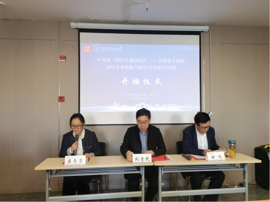 2024年3月11日下午,中卫市“国培计划(2023)”—县级骨干教师及培养对象能力提升(小学数学)培训班在银川市顺利开班。继续教育学院副院长荆孝民出席开班仪式并致辞,来自中卫市县级小学50名骨干数学教师及继续教育学院培训中心相关工作人员参加开班仪式。