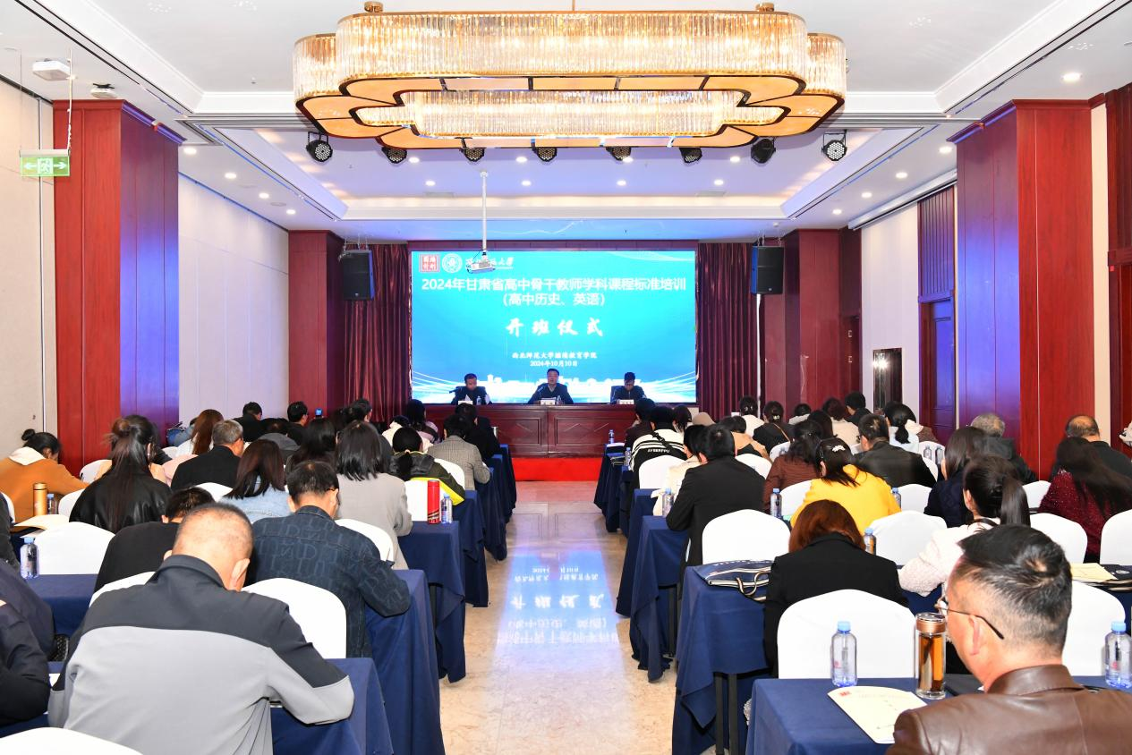 10月10日上午,2024年甘肃省高中骨干教师学科课程标准培训(高中历史、英语)在西北师范大学顺利开班。继续教育学院院长赵辉,附属中学中级教师徐长亮出席开班仪式。继续教育学院培训中心主任丁波主持开班仪式。来自甘肃省的150名骨干教师及相关工作人员参加开班仪式。