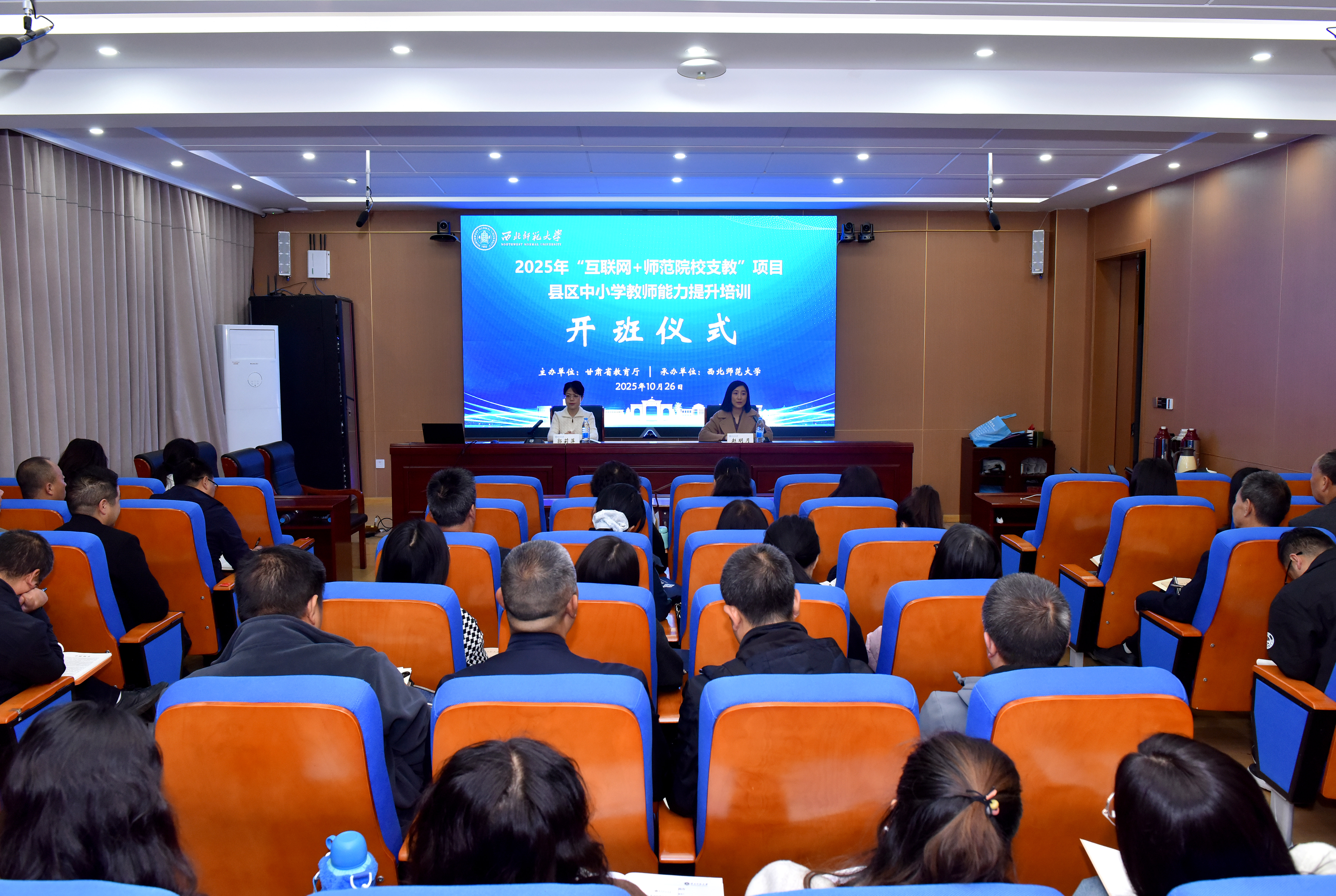 为响应教育数字化战略行动,缩小区域教育差距,推动农村地区基础教育高质量发展,10月26日上午,2025年“互联网+师范院校支教”项目县区中小学教师能力提升培训开班仪式在西北师范大学知行校区南风楼106报告厅举行。西北师范大学继续教育学院副院长郭莉萍出席仪式并致辞,来自临夏回族自治州、陇南市的95名骨干教师及西北师大继续教育学院相关工作人员参加仪式。