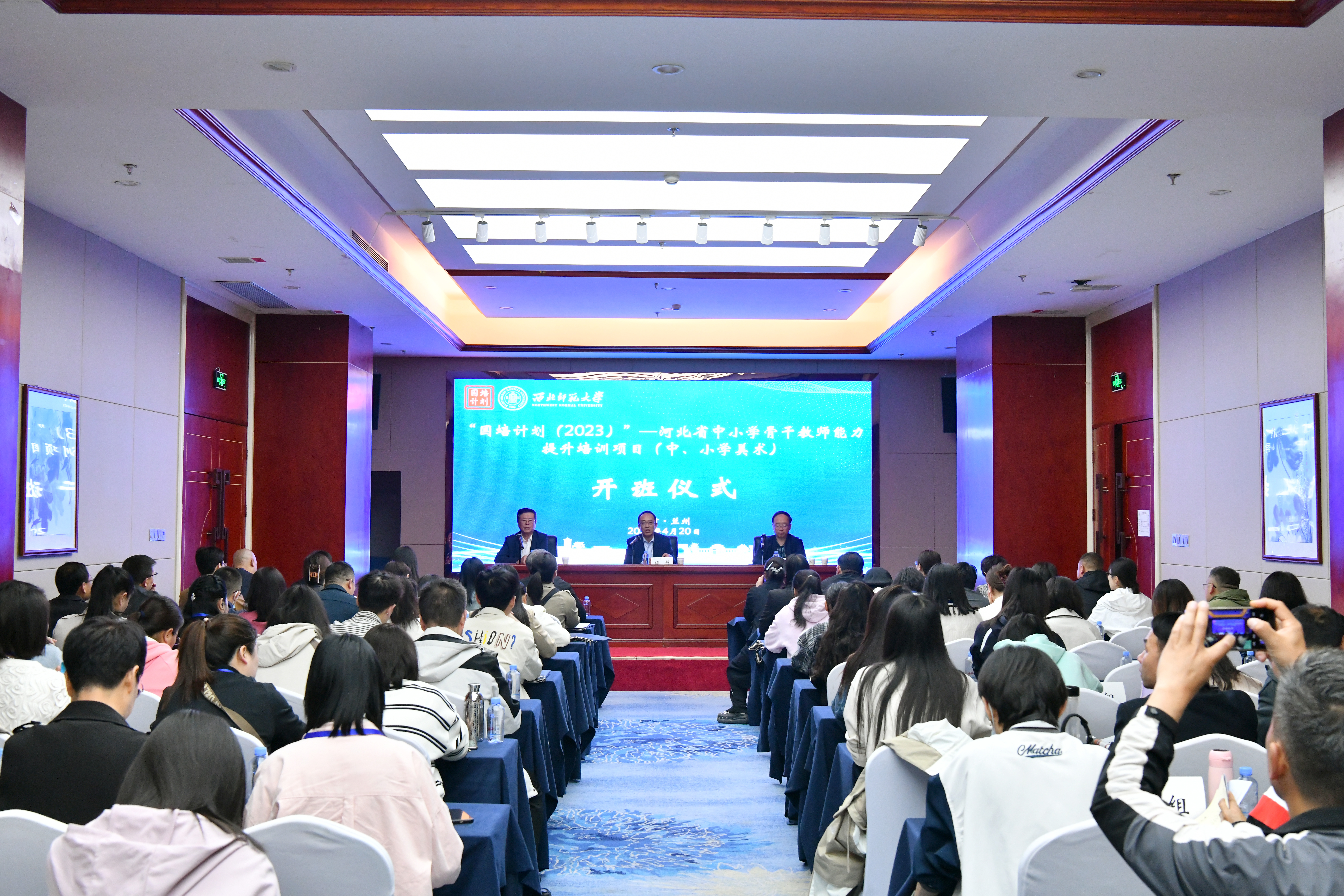 2024年4月20日上午,河北省“国培计划(2023)”—中西部骨干项目市级骨干教师省外研修(中、小学美术)项目在西北师范大学顺利开班。继续教育学院党委书记陈科出席开班仪式并致辞。美术学院教授、项目学科负责人杨明,继续教育学院培训中心项目主任甘悦以及来自河北省的100名骨干教师参加开班仪式。