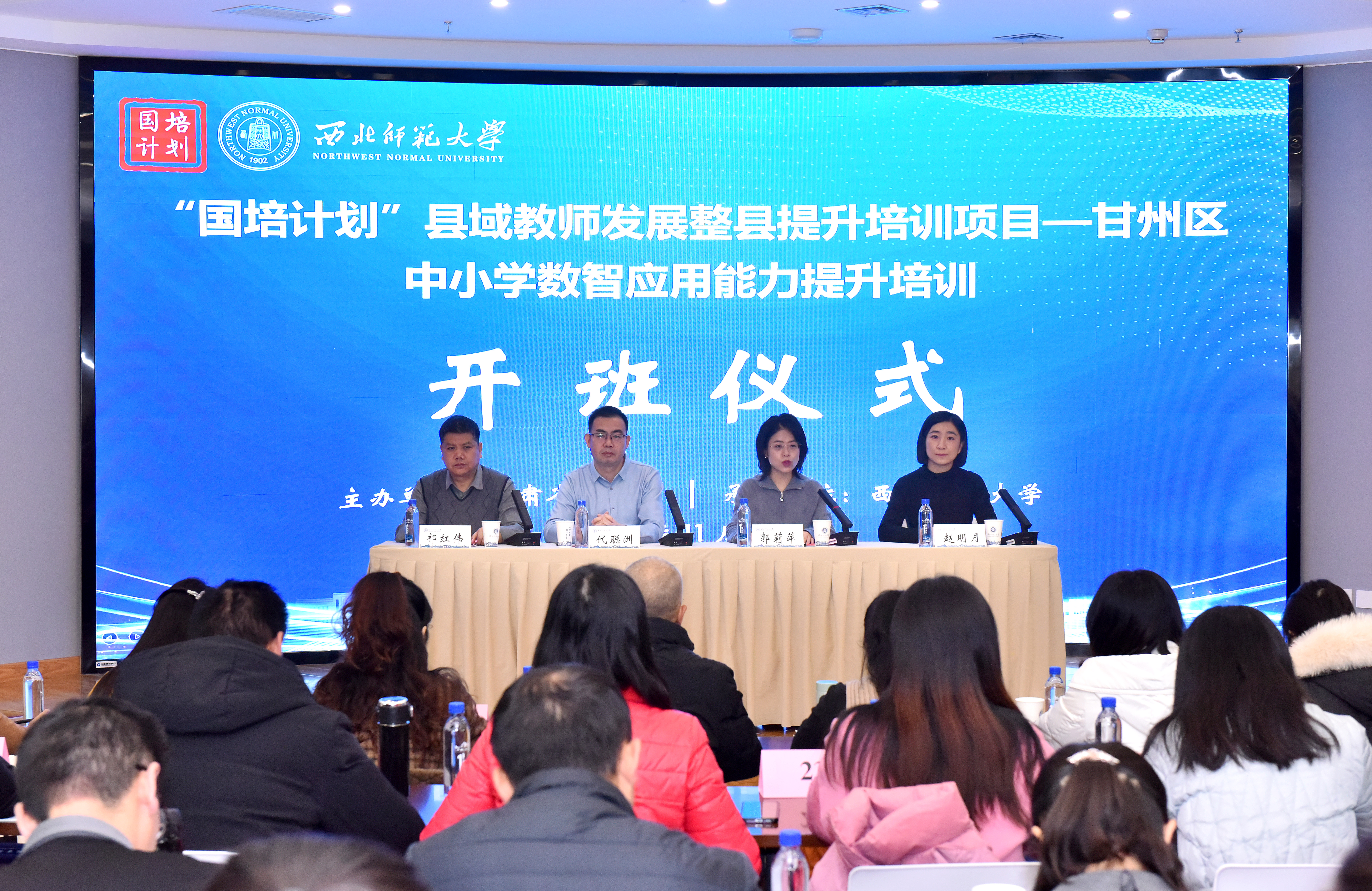 2025年11月30日上午,“国培计划(2025)”县域教师发展整县提升培训项目——甘州区中小学数智应用能力提升培训班开班仪式在西北师范大学国际学术交流中心举行。甘州区教育局党组成员、副局长代聪洲,甘州区教育局教研室副主任祁红伟,西北师范大学继续教育学院副院长郭莉萍出席仪式并讲话。来自甘州区中小学的56位骨干教师参加仪式,仪式由西北师范大学继续教育学院教师主持。