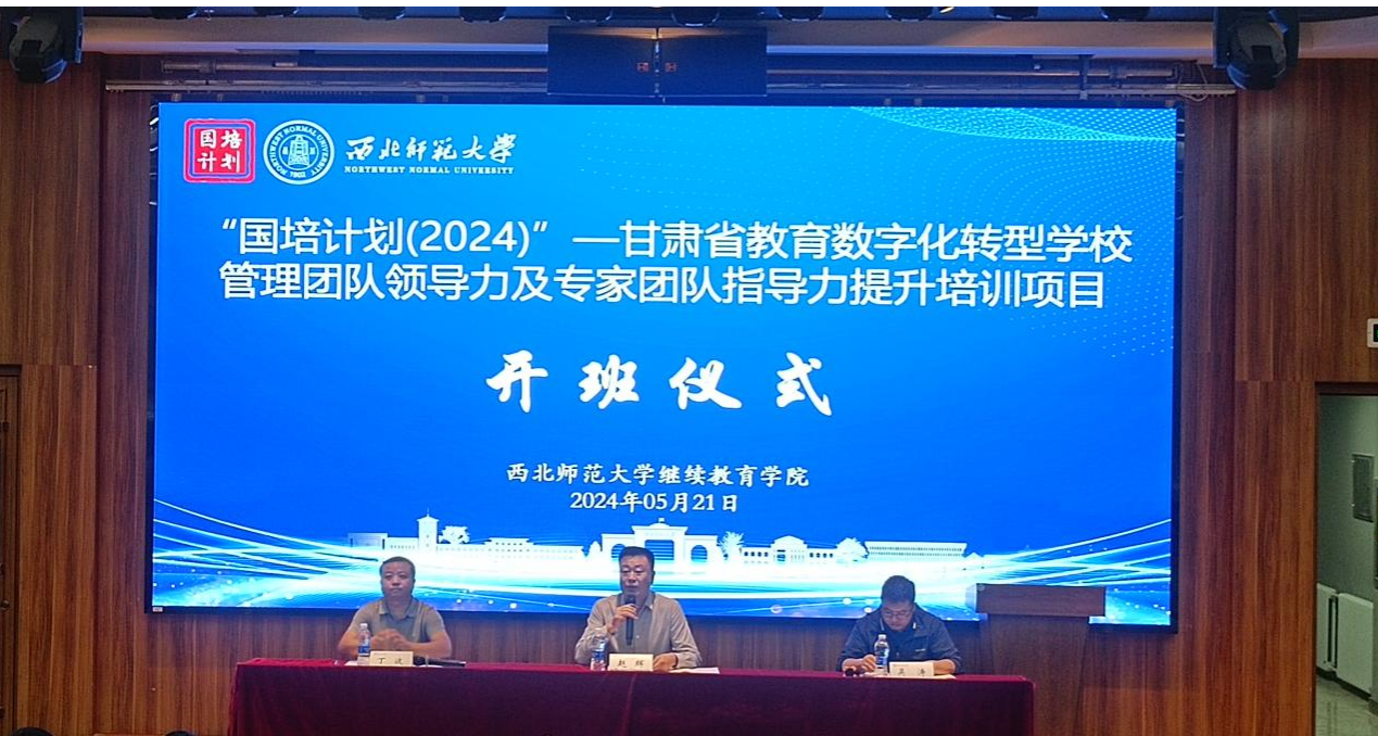2024年5月21日上午,“国培计划(2024)”——甘肃省教育数字化转型学校管理团队领导力及专家团队指导力提升培训在西北师范大学顺利开班。继续教育学院院长赵辉出席开班仪式并致辞。学科负责人吴涛、继续教育学院培训中心主任丁波以及来自甘肃省各市州的300名教育数字化领域相关人员参加开班仪式。