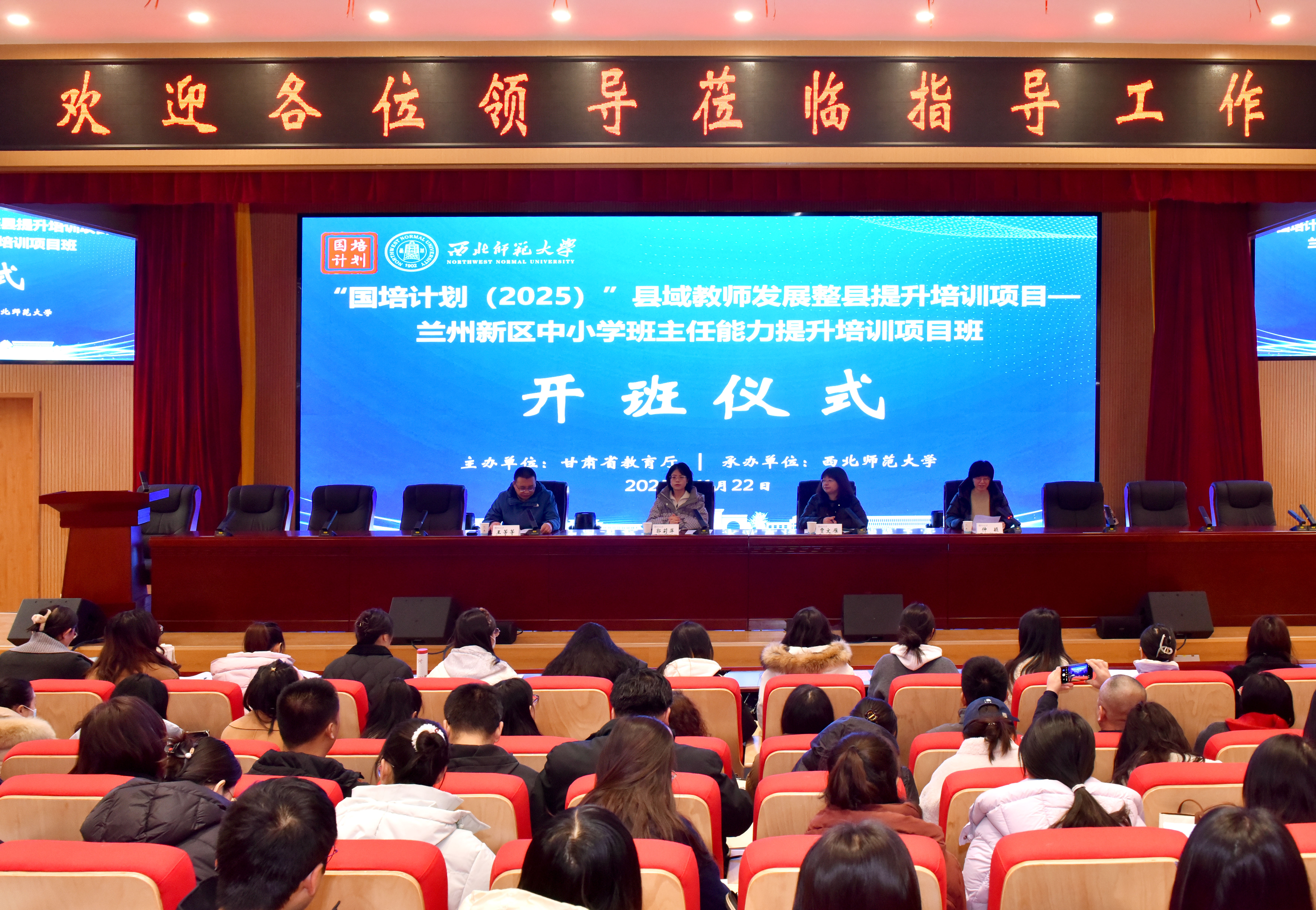2025年11月22日上午,“国培计划(2025)”县域教师发展整县提升培训项目—兰州新区中小学班主任能力提升培训在西北师范大学开班。兰州新区教育和卫生健康委员会(疾病和预防控制局)教师工作科科长贾文雁,继续教育学院副院长郭莉萍,教育科学学院副教授、项目学科负责人王等等出席开班仪式并讲话。来自兰州新区的100名中小学班主任参加开班仪式。仪式由继续教育学院培训中心教师主持。