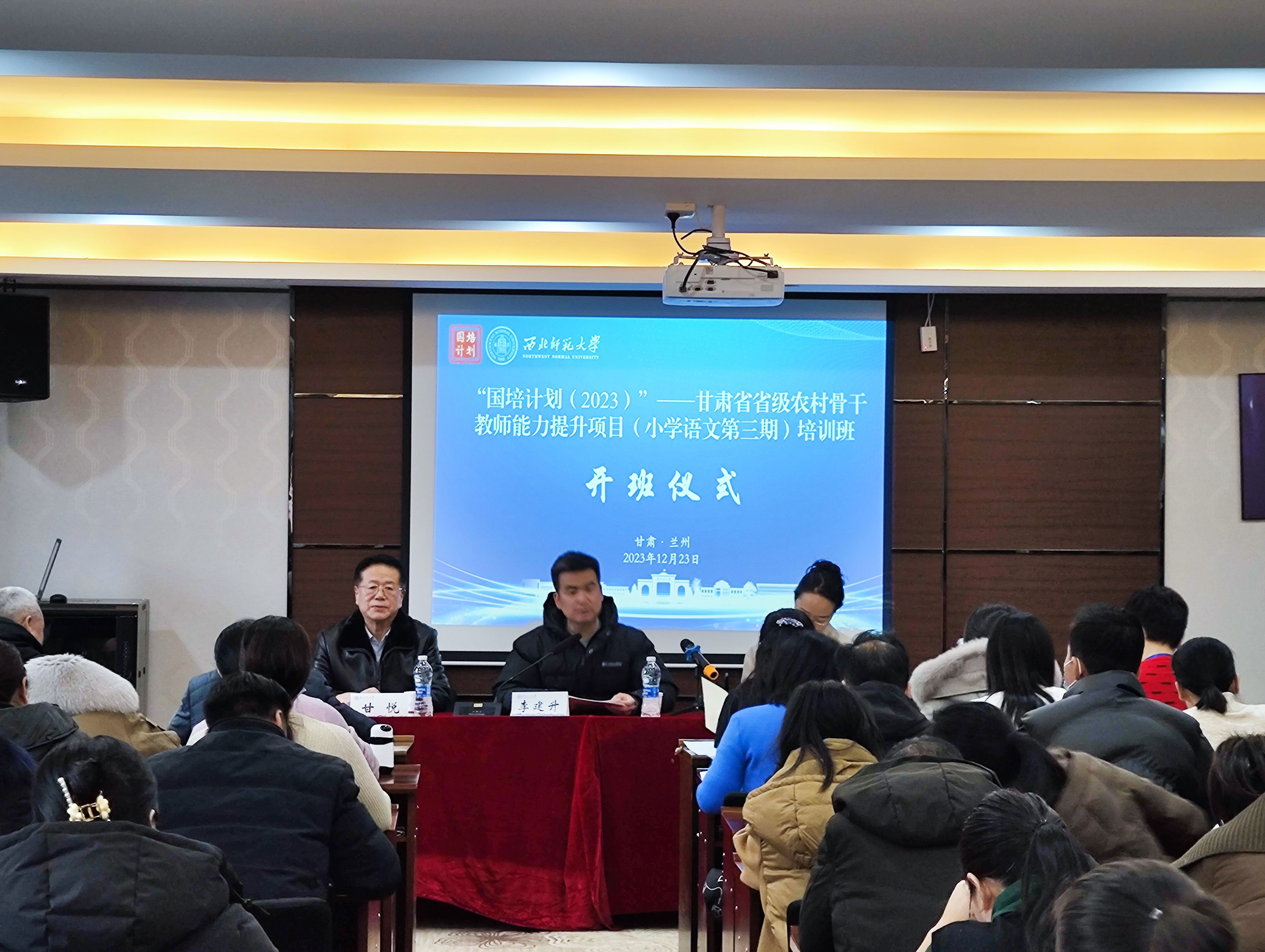 2023年12月23日上午,“国培计划(2023)”—甘肃省省级农村骨干教师(小学语文)能力提升培训(第三期)顺利开班。甘肃省教师发展中心常务副主任、继续教育学院副院长李建升,教师教育学院教授、项目学科负责人李金云,继续教育学院培训中心负责人以及来自全省的100名农村小学语文骨干教师出席开班仪式。