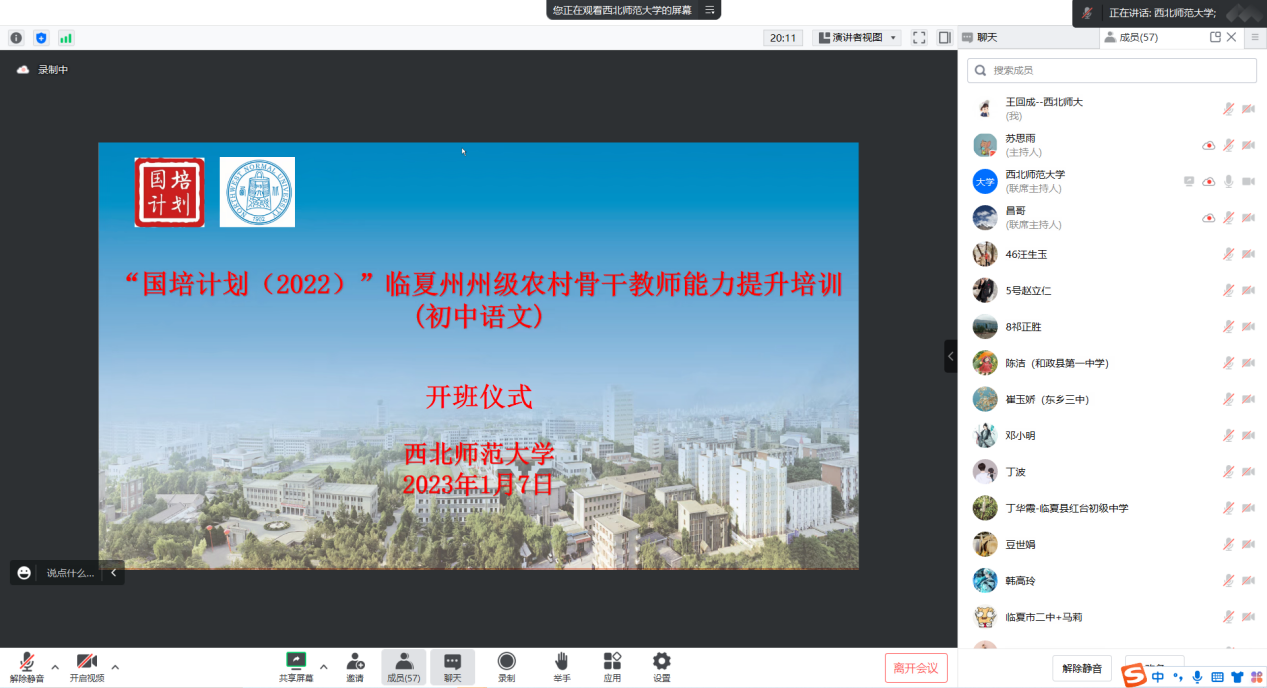 1月7日上午,由我院承办的“国培计划(2022)”临夏州州级农村骨干教师能力提升培训(初中语文)以线上形式顺利开班。临夏州教育局党组成员、副局长吕福昌,临夏州教育局教师发展科科长石伶俐,西北师范大学继续教育学院副院长姚军,西北师范大学继续教育学院培训中心甘悦以及来自临夏州的50位农村初中语文骨干教师参加了开班仪式。开班仪式由甘悦主持。
