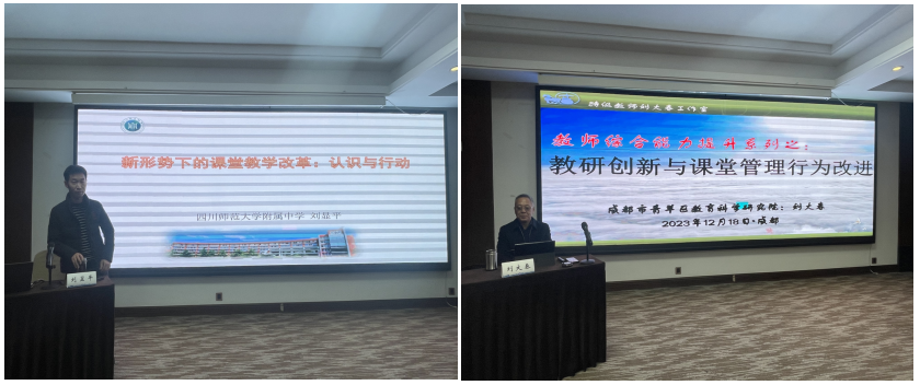 开班仪式后,由四川师范大学附属中学教科室主任刘显平、成都市青羊区教育科学研究院视导员刘大春分别作了题为《新形势下的学校课堂教学改革》《教研创新与课堂管理行为改进》专题讲座。