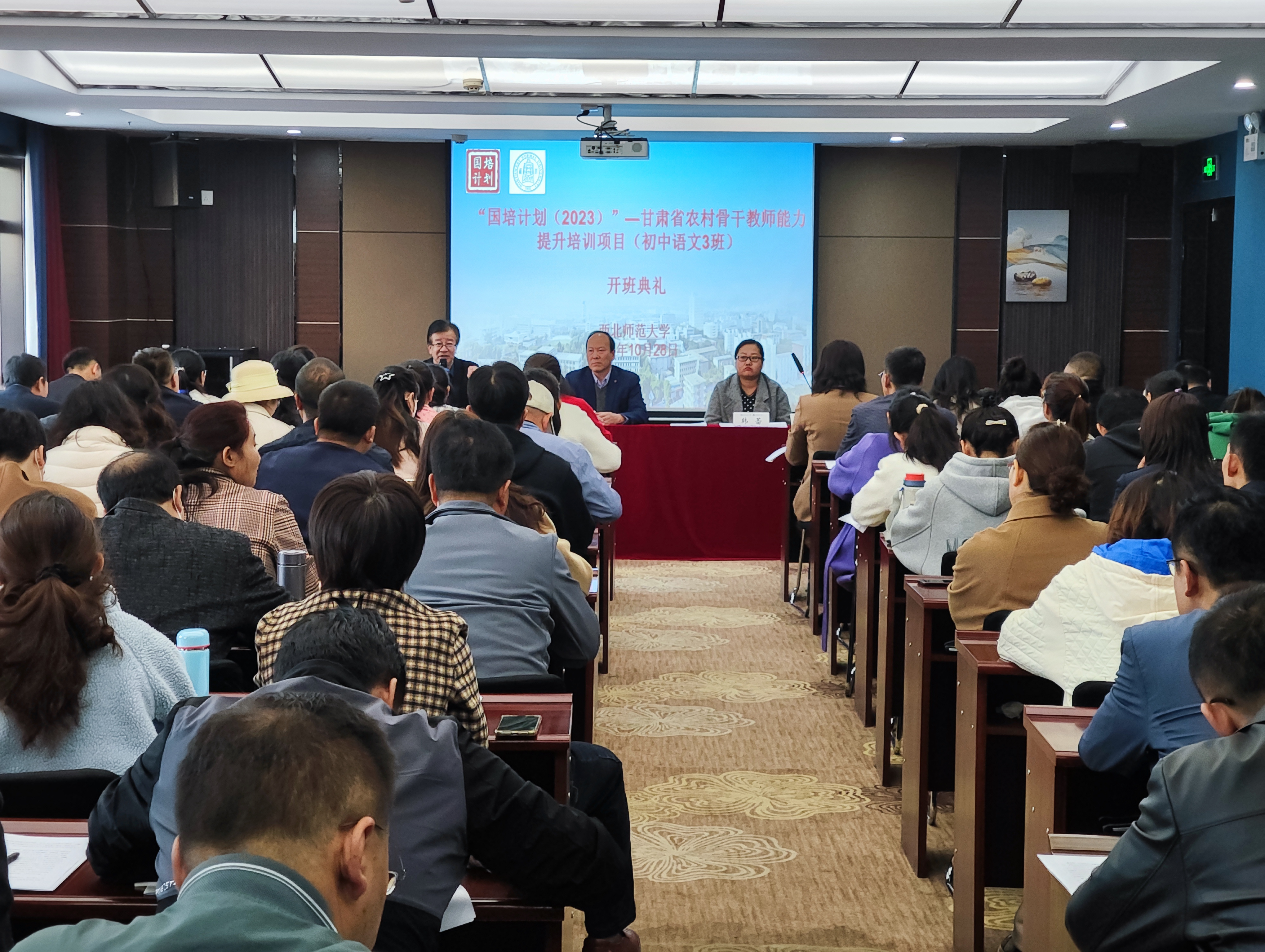 1028日上午,“国培计划(2023)”—甘肃省省级农村骨干教师(初中语文)能力提升培训在西北师范大学顺利开班。西北师范大学继续教育学院副院长李玉泉、项目学科负责人石义堂教授、培训中心项目负责人以及来自全省100名初中语文骨干教师参加开班仪式。