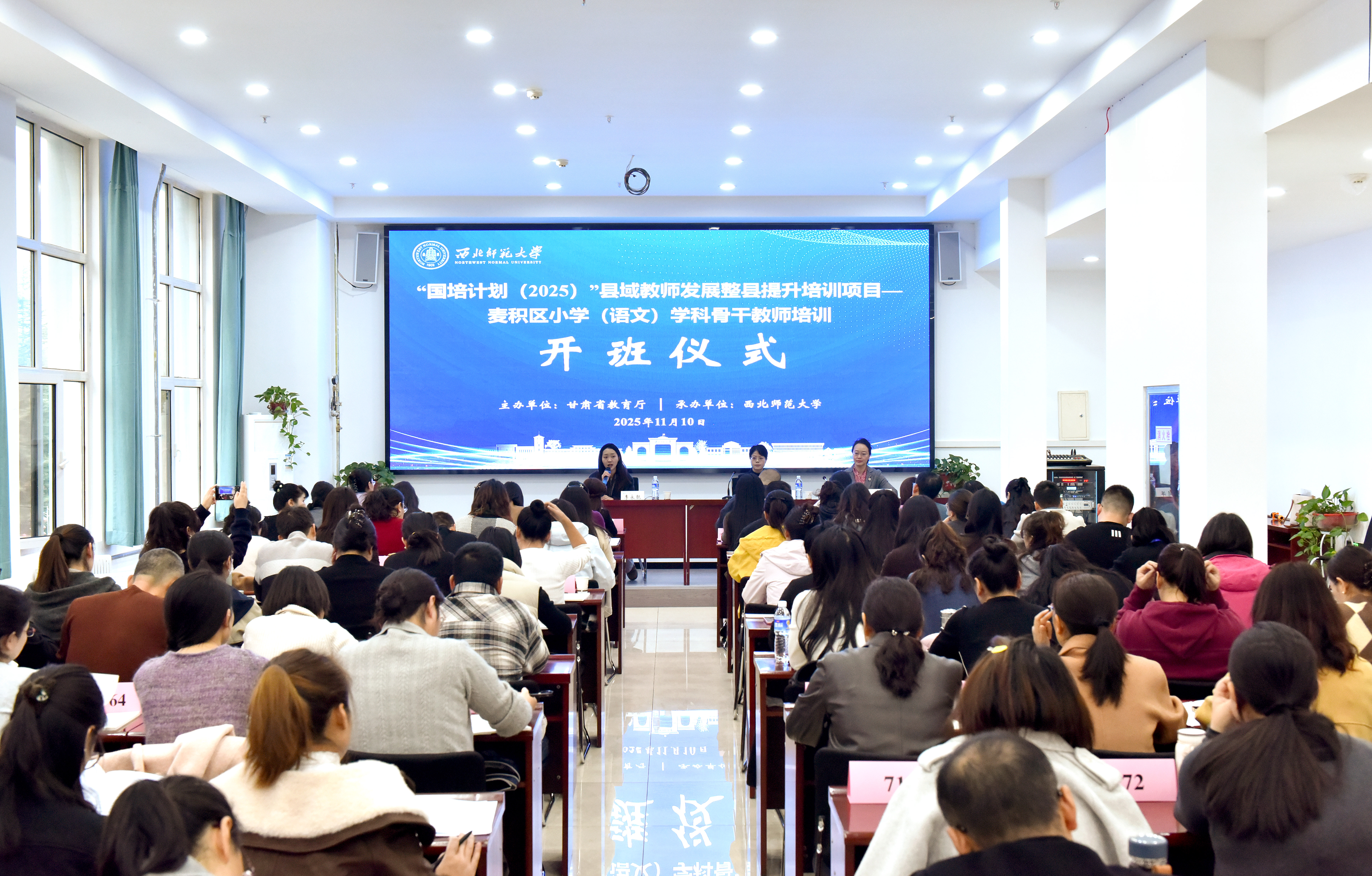2025年11月10日上午,“国培计划(2025)”县域教师发展整县提升培训项目--麦积区小学(语文)学科骨干教师培训开班。继续教育学院副院长郭莉萍,教师教育学院教授、项目学科负责人李金云出席开班仪式并讲话。来自天水市麦积区的110名小学语文教师参加开班仪式,仪式由继续教育学院师资培训中心教师主持。