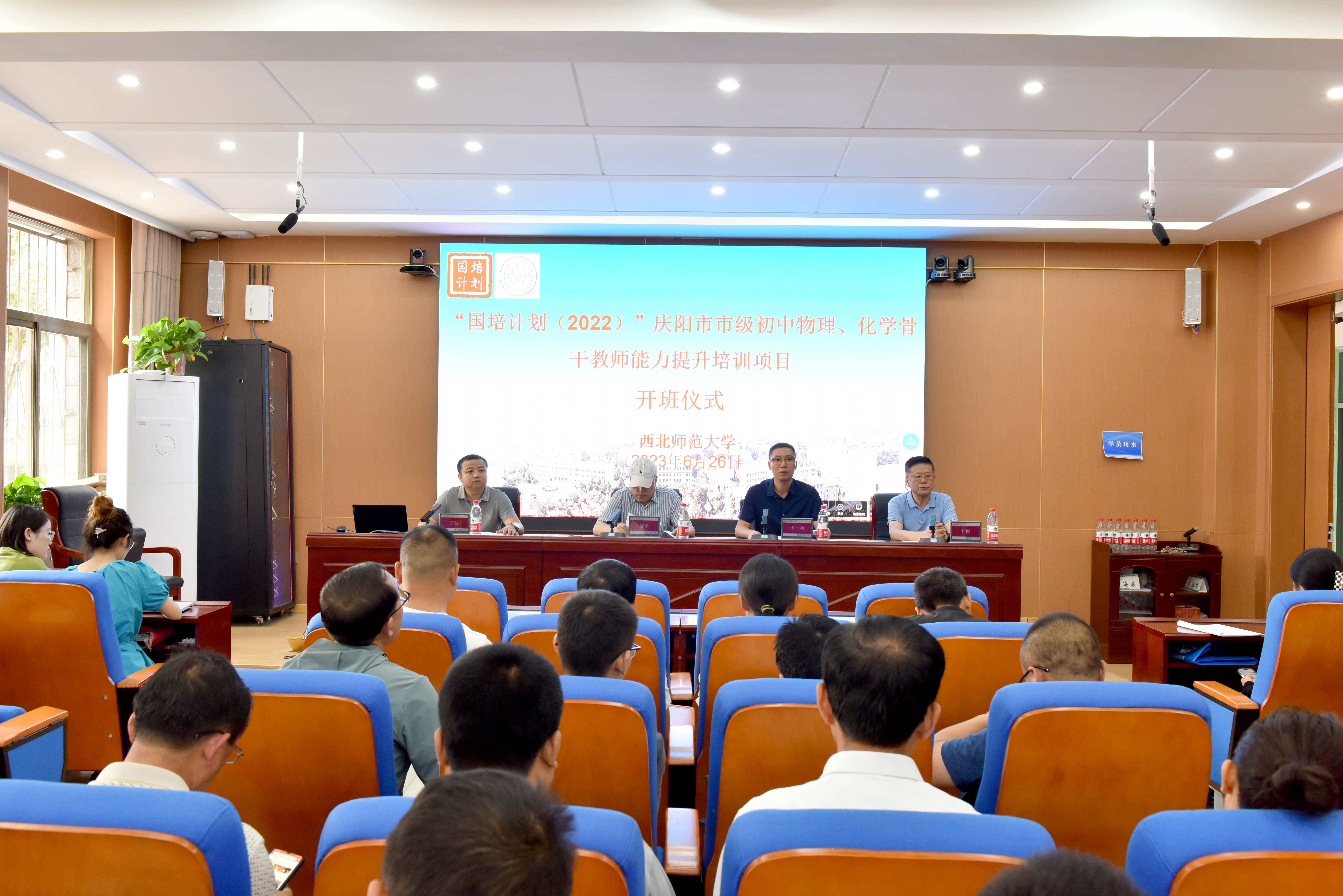 2023年6月26日上午,由西北师范大学继续教育学院承办的“国培计划(2022)”庆阳市市级初中物理、化学骨干教师能力提升培训班在西北师范大学知行校区南风楼举行开班仪式。西北师大继续教育学院副院长姚军,西北师大教师教育学院教授毕吉利,西北师大继续教育学院培训中心主任丁波,西北师大继续教育学院培训中心项目主任甘悦以及来自甘肃省庆阳市的50位物理骨干教师和50位化学骨干教师参加了开班仪式。