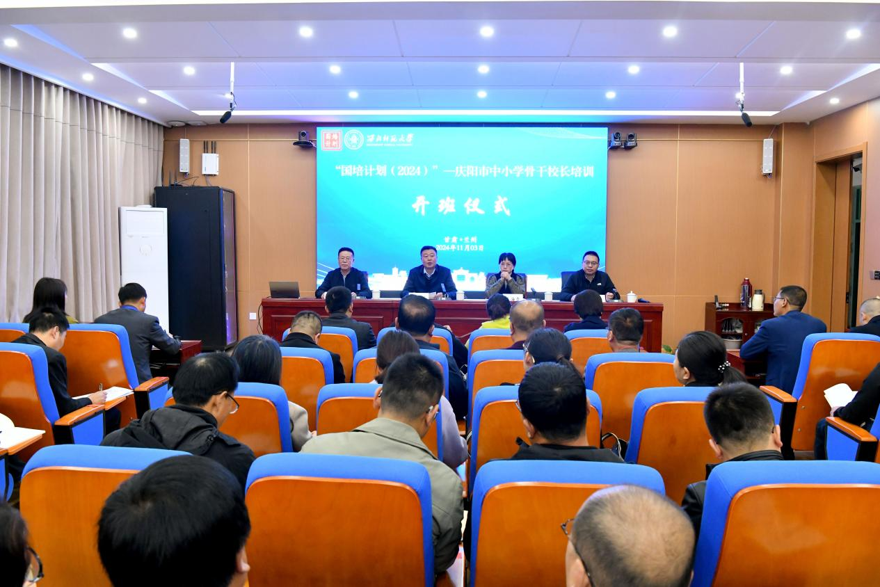 2024年11月3日上午,“国培计划(2024)”—庆阳市中小学骨干校长培训在西北师范大学顺利开班。西北师范大学继续教育学院院长赵辉,庆阳市教师发展中心主任李海霞及西北师范大学教育科学学院副教授、项目学科负责人王等等出席开班仪式。开班式由继续教育学院培训中心项目主任甘悦主持。来自庆阳市的115名中小学骨干校长以及西北师范大学继续教育学院培训中心相关工作人员参加开班仪式。
