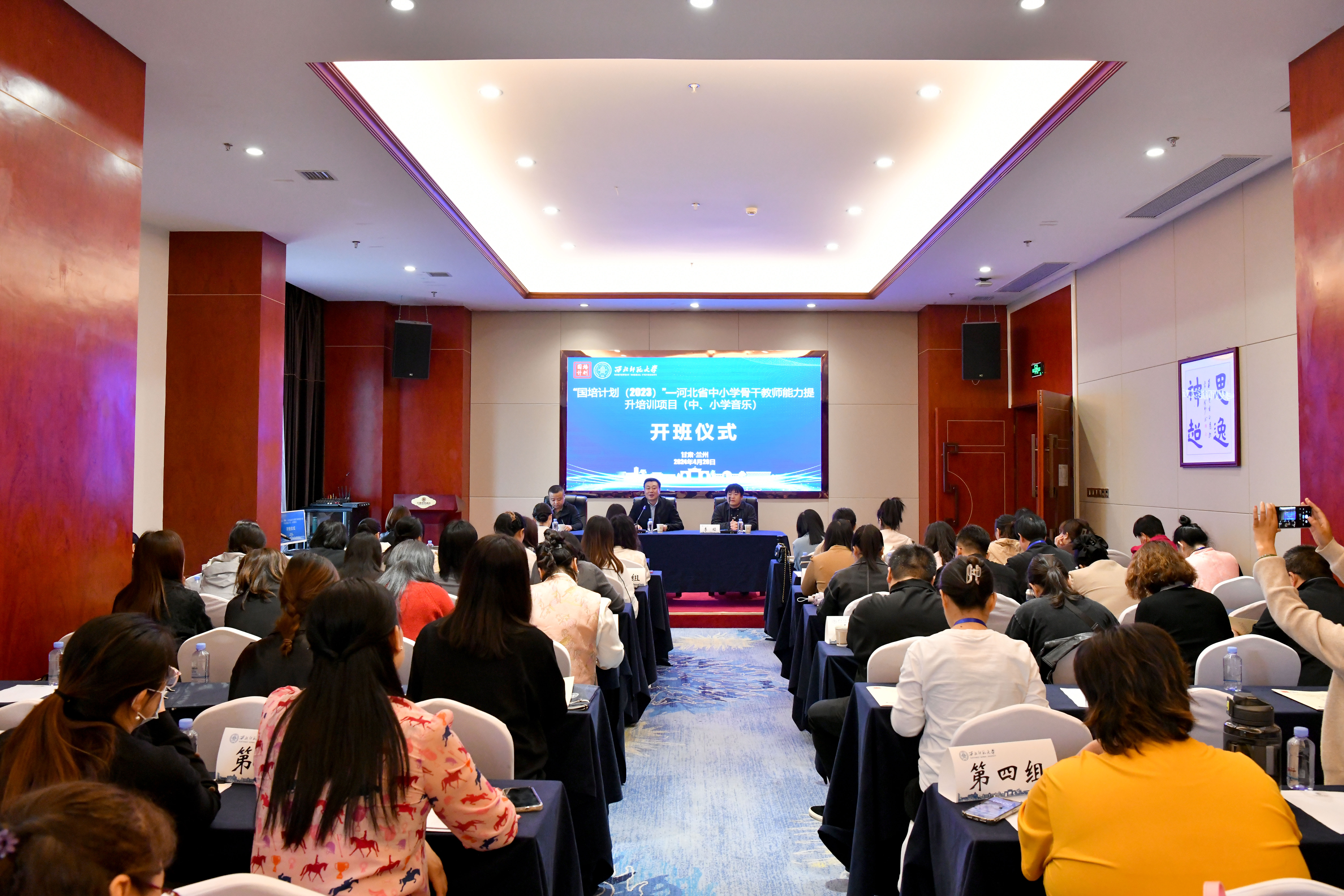 2024年4月20日上午,河北省“国培计划(2023)”—中西部骨干项目市级骨干教师省外研修(中、小学音乐)项目在西北师范大学顺利开班。继续教育学院院长赵辉出席开班仪式并致辞。音乐学院副教授、项目学科负责人李经,继续教育学院培训中心主任丁波,以及来自河北省的100名骨干教师参加开班仪式。