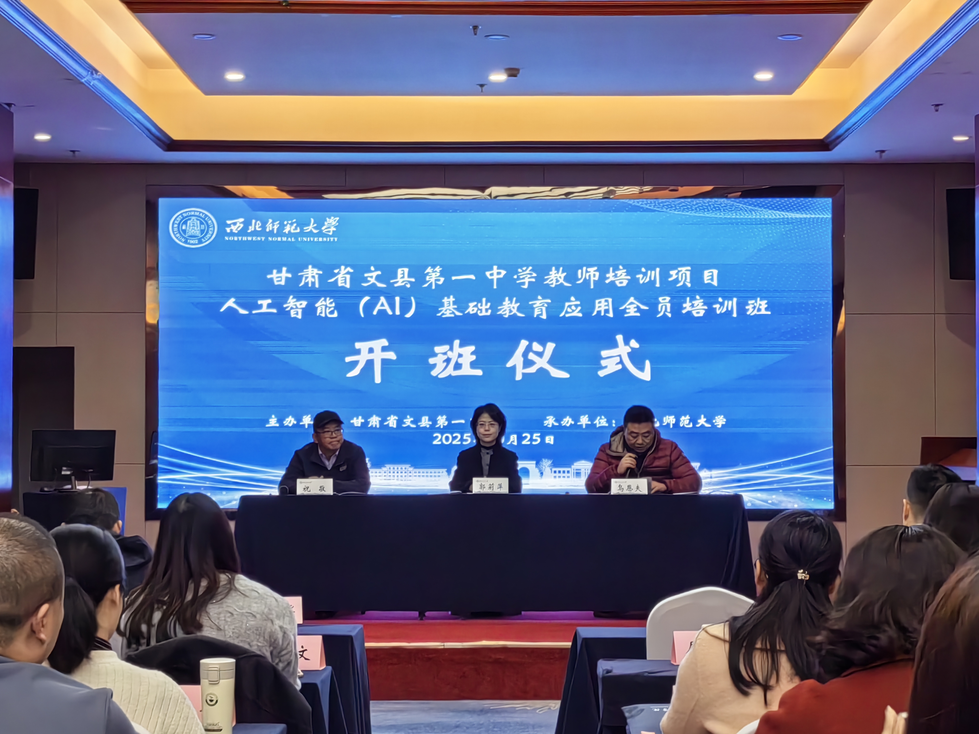 为深入贯彻《中共中央 国务院关于全面深化新时代教师队伍建设改革的意见》精神,扎实推进教育数字化战略落地,2025 年 10 月 25 日上午,甘肃省文县第一中学教师人工智能(AI)基础教育应用全员培训开班仪式在西北师大举行。西北师范大学继续教育学院副院长郭莉萍,文县第一中学副校长祝敬出席仪式并致辞,文县一中 50 名在职教师及继续教育学院相关工作人员参加仪式。开班仪式由继续教育学院培训中心乌恩夫主持。