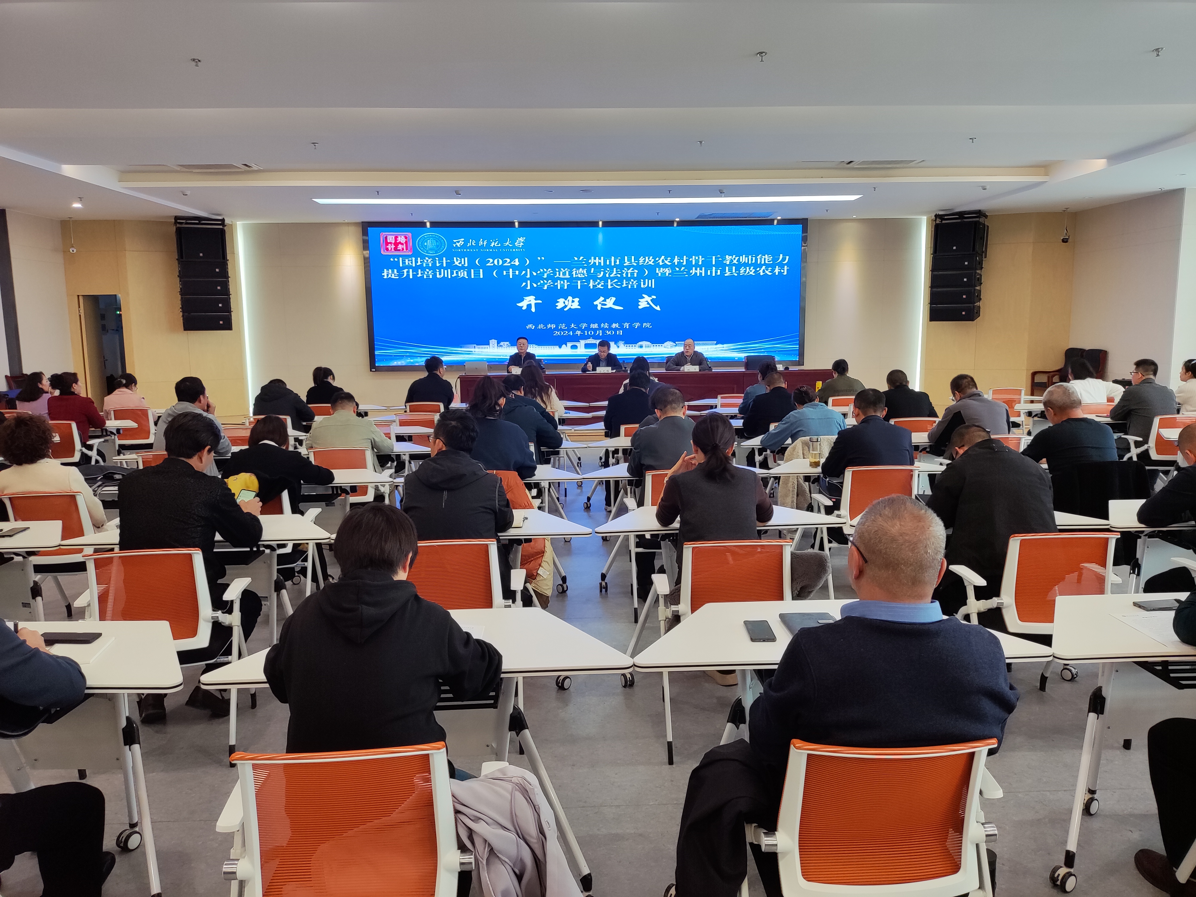 2024年10月30日下午,“国培计划(2024)”—兰州市县级农村骨干教师能力提升培训项目(中小学道德与法治)暨兰州市县级农村小学骨干校长培训班顺利开班。兰州市教育局党组成员、市政府教育督导机构专职督学金光耀,西北师范大学继续教育学院副院长姚军出席开班仪式并讲话。来自全市的县级农村中小学道德与法治骨干教师180名、县级农村小学骨干校长60名以及兰州市教育局教师工作科和西北师范大学继续教育学院相关负责人参加了开班仪式。