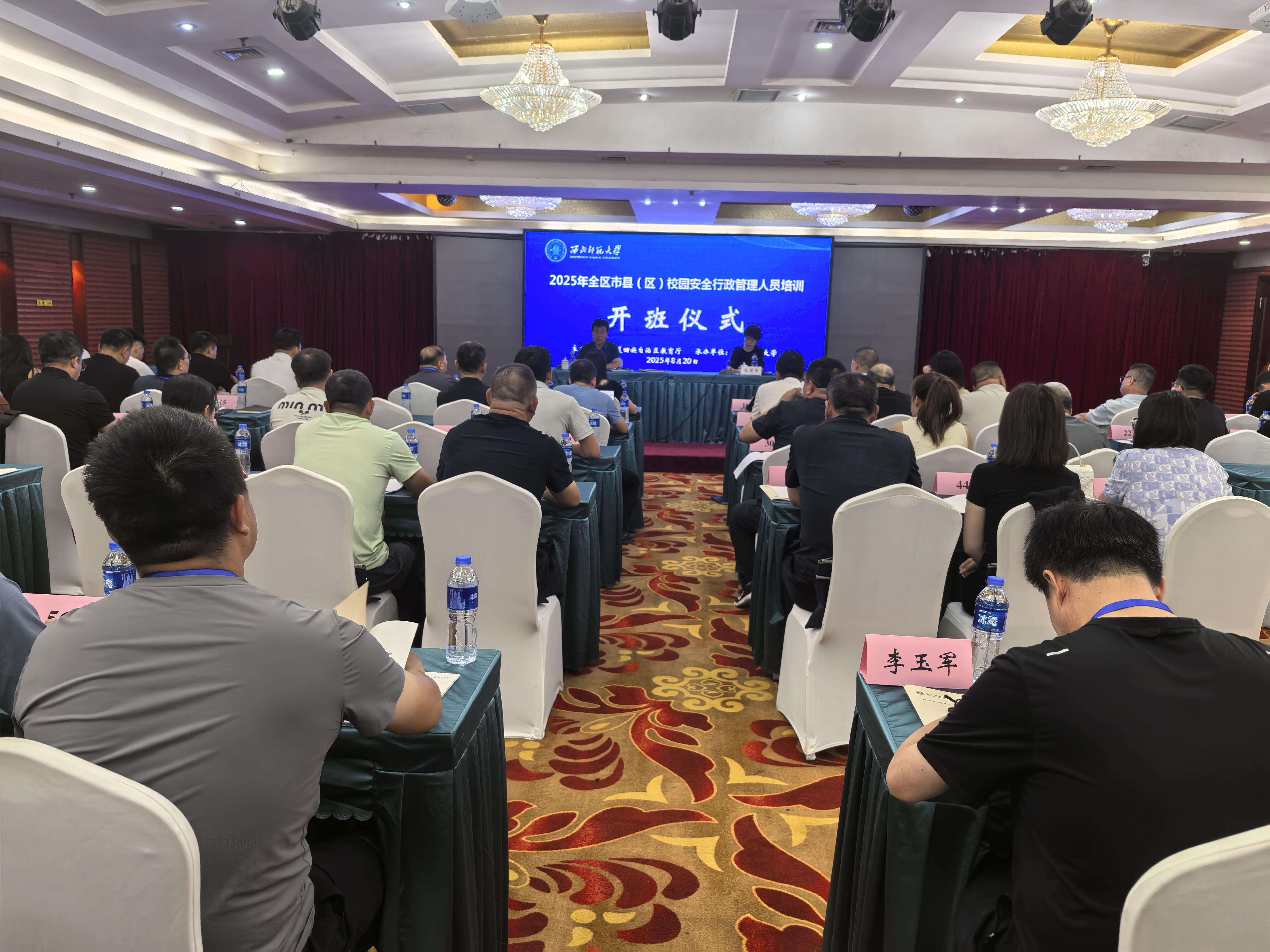2025年8月20日,2025年全区市县(区)校园安全行政管理人员培训在银川顺利开班。宁夏回族自治区教育厅体育卫生与艺术教育处处长张建隆、西北师范大学继续教育学院副院长郭莉萍出席开班仪式。来自全区市县(区)的校园安全行政管理人员75人,以及西北师范大学继续教育学院相关工作人员参加开班仪式。