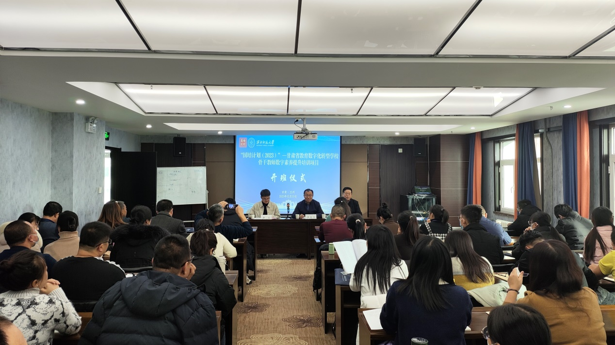2023年12月15日下午,“国培计划(2023)”—教育数字化转型学校骨干教师数字素养提升培训班一班在西北师范大学顺利开班。继续教育学院院长杨纳名、授课专家房立、继续教育学院培训中心相关负责人及来自白银、天水、陇南的105名教师参加仪式。