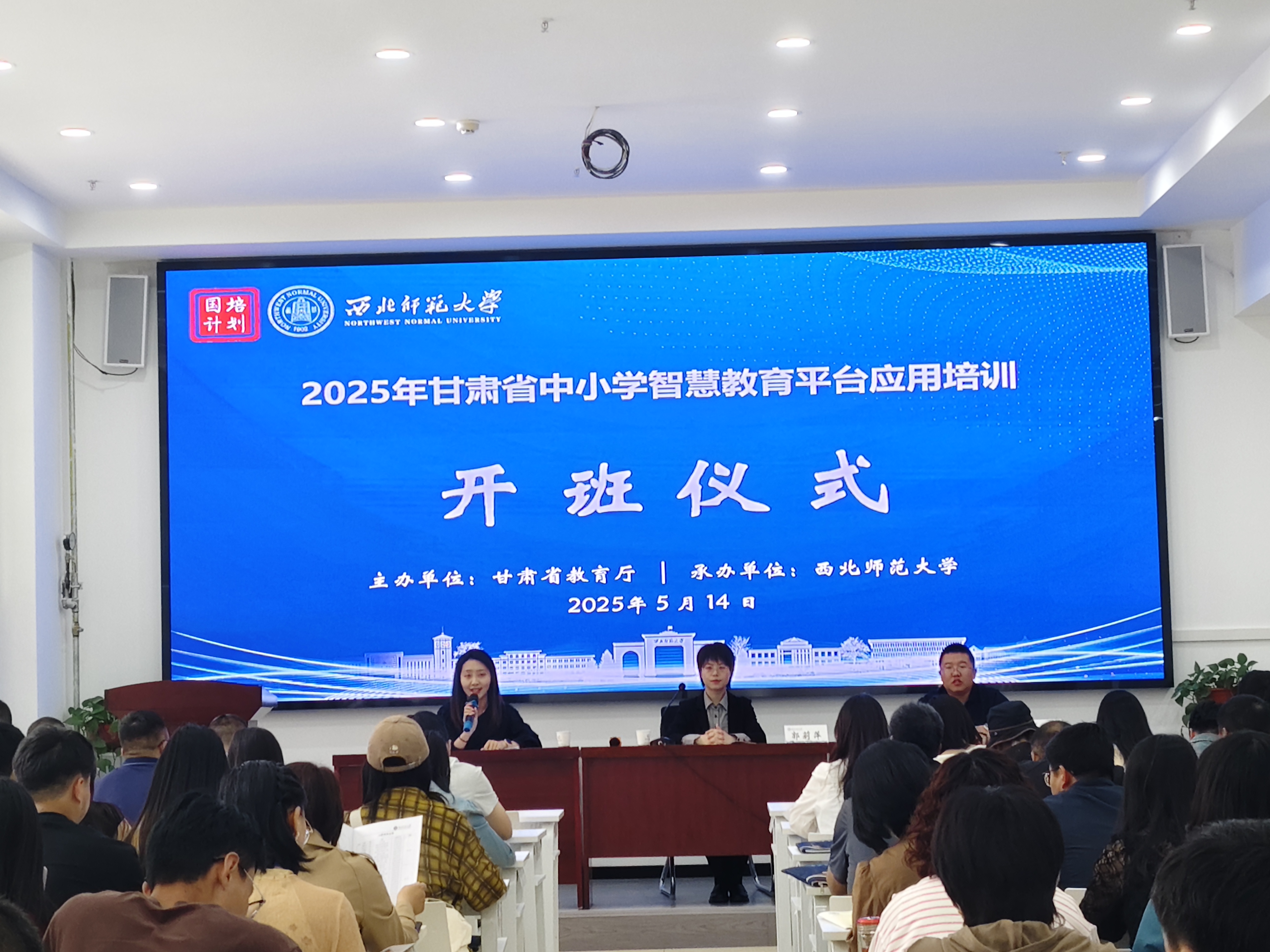 2025年5月14日,由甘肃省教育厅主办、西北师范大学承办的2025年甘肃省中小学智慧教育平台应用(第二期)培训如期举行。继续教育学院副院长郭莉萍、宁夏幼儿师范高等专科学校副教授吴涛出席开班仪式,来自全省的180名中小学骨干教师齐聚兰州,共同探索智慧教育平台的创新应用。开班仪式由继续教育学院培训中心教师主持。