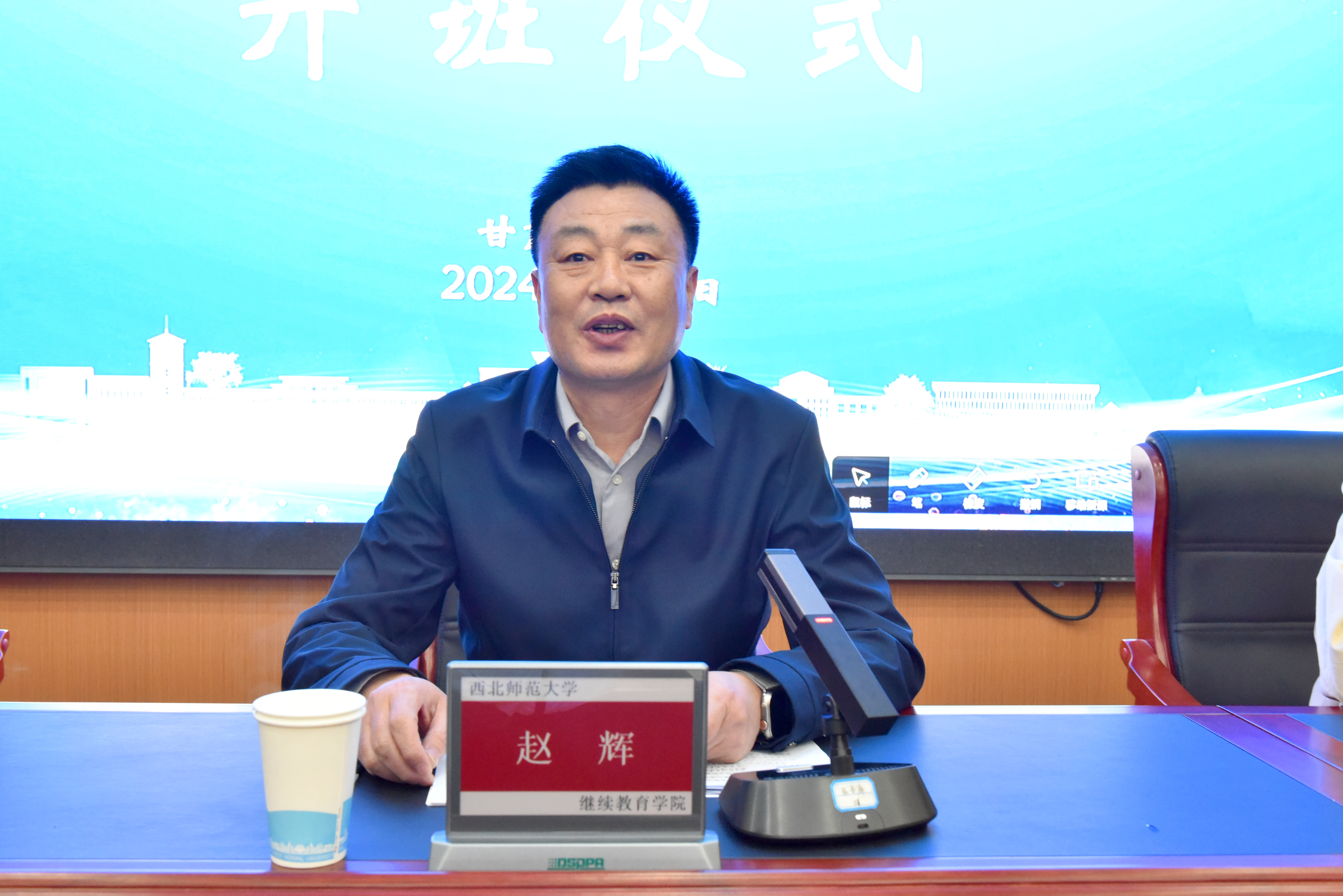 赵辉在致辞中首先对来自河北省的100名中小学骨干教师表示了热烈欢迎。他介绍了西北师范大学的办学历史及继续教育的办学情况。他指出,各位骨干教师是河北省中小学教师中的佼佼者,是基础教育的顶梁柱,是推动教育均衡发展的中坚力量,希望各位学员能够珍视此次培训机会,在培训学习中提高思想认识,遵守纪律,注重培训实效,通过培训掌握新理念、新方法,产生新思想、新认识,取得新成效新突破。继续教育学院将以饱满的工作热情、积极的工作态度认真办好此次培训,确保此次培训工作顺利开展。