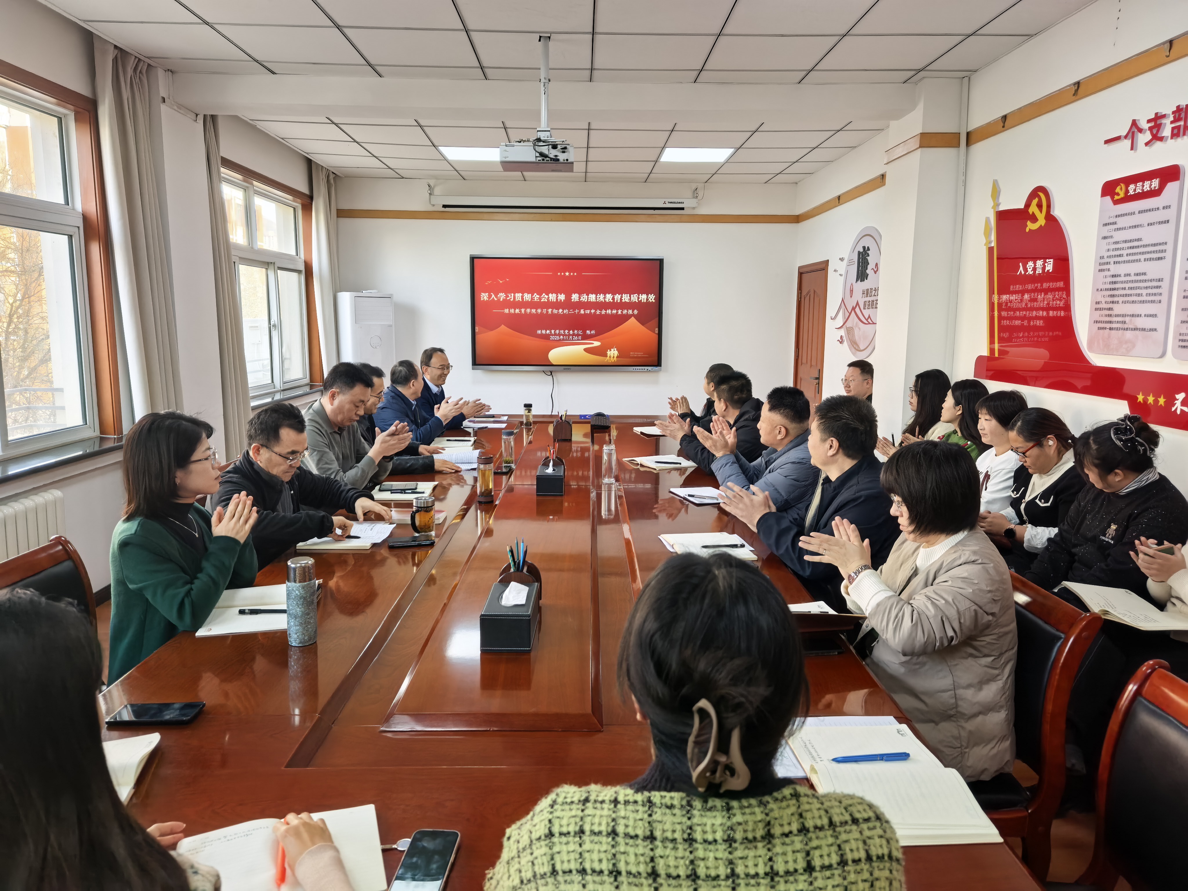 按照学校党委安排,11月26日,继续教育学院举行学习贯彻党的二十届四中全会精神宣讲报告会。党委书记陈科作宣讲报告,副院长、教工支部书记马占寿主持,院领导赵辉、王文槐、李玉泉、郭莉萍及学院全体党员、干部和职工参加报告会。