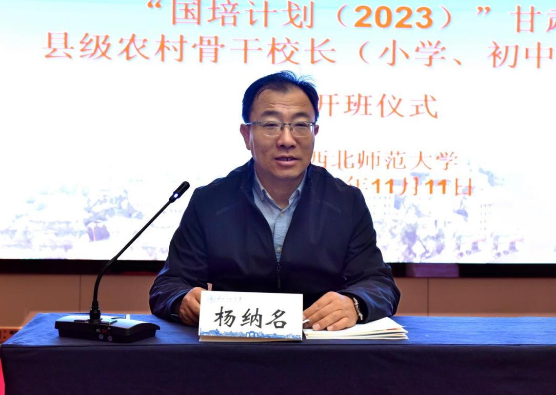 2023年11月11日上午,“国培计划(2023)”—甘肃省县级农村骨干校长(小学、初中)培训班在西北师大顺利开班。兰州市人民政府教育督导机构专职督学金光耀、西北师范大学继续教育学院院长杨纳名、西北师范大学继续教育学院副院长李建升、兰州市教育局教师工作科科长王阳以及来自甘肃省县级农村120名中小学骨干校长出席本次开班仪式,李建升主持开班仪式。