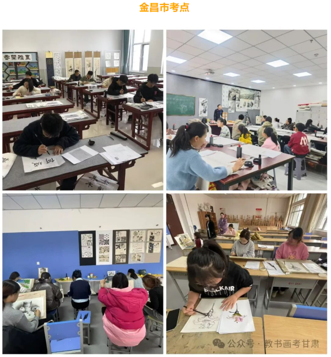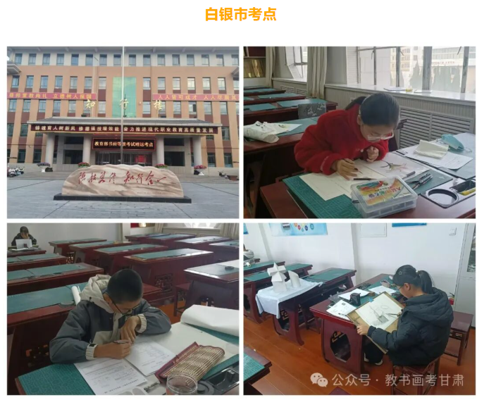 11月23日—24日,教育部教育考试院书画等级考试在甘肃考区顺利举行。此次考试在兰州市、天水市、白银市、定西市、庆阳市、金昌市、武威市、陇南市、平凉市、酒泉市、嘉峪关市、张掖市、临夏州、甘南州共14个市州设置了考点,涉及软笔书法、硬笔书法、素描、国画(花鸟、山水、人物)、动漫画、色彩8个科目。