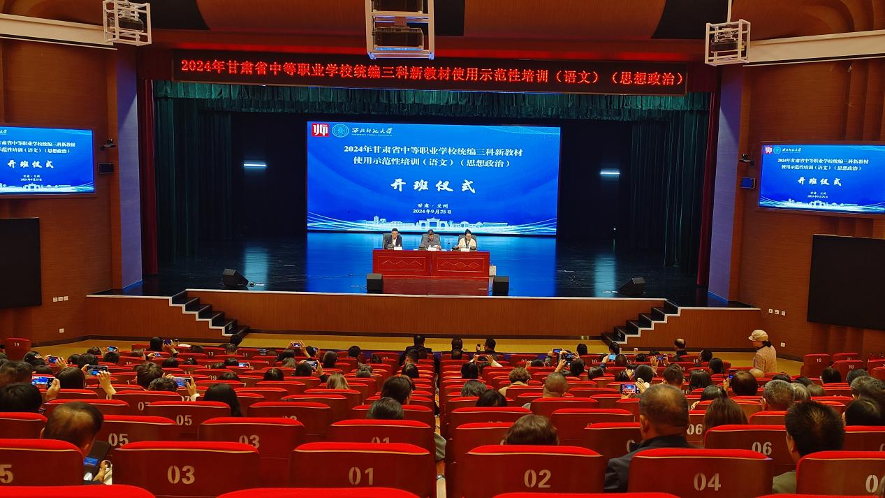 2024年9月25日上午,2024年甘肃省中等职业学校统编三科新教材使用示范性培训(语文、思想政治)培训班在兰州新区职教园区顺利开班。西北师范大学省教师发展中心常务副主任、继续教育学院副院长李建升,语文学科负责人、西北师范大学教师教育学院教授李金云出席开班仪式。来自甘肃省各市(州)的240位参训老师及继续教育学院培训中心工作人员参加开班仪式。