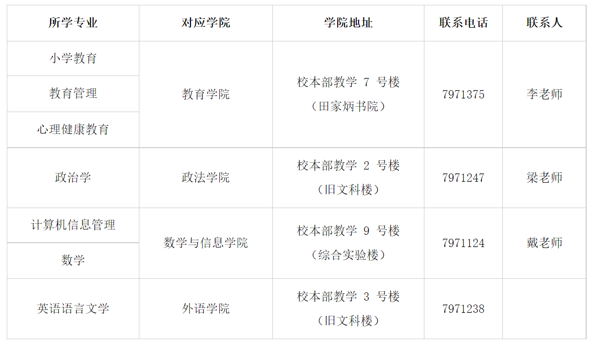 具体的专业、对应学院、联系方式见下表: