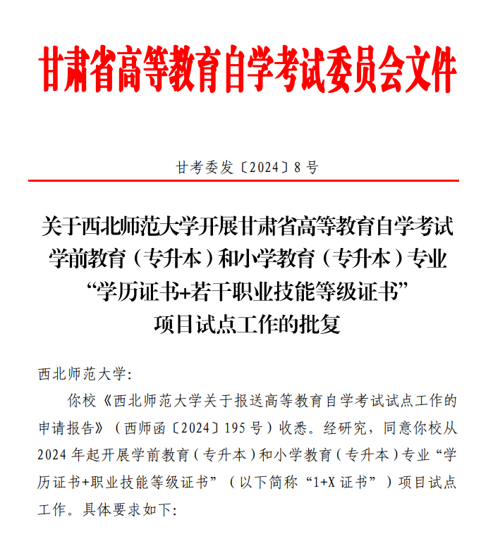 近日,甘肃省高等教育自学考试委员会公布《关于西北师范大学开展甘肃省高等教育自学考试学前教育(专升本)和小学教育(专升本)专业“学历证书+若干职业技能等级证书”项目试点工作的批复》,我校学前教育和小学教育2个专业的自学考试考核将与教师资格证书有机结合,实现证书课程与自学考试课程成果互认,使用国家教育行政部门认定的教师资格证书整体顶替自学考试相关课程。